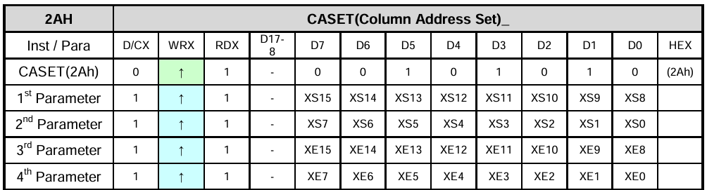 Before writing color data to the ST7735S, the address must be set to specify which pixel on the LCD will receive the color data. Commands 0x2A and 0x2B are used to set the column and row addresses, respectively: