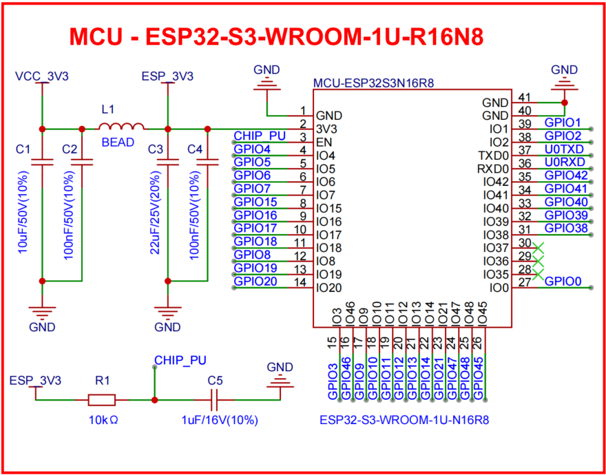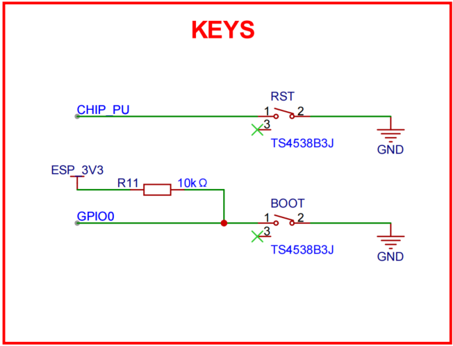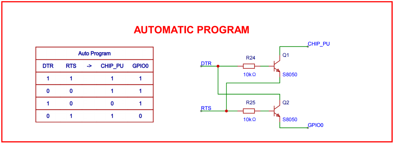 As shown in the figure, an auto-download circuit is integrated to enable automatic programming of the device. By controlling the BOOT and RST states, this circuit can automatically enter download mode when the user initiates programming, making firmware updates and debugging more convenient. With this auto-download circuit, users can upload new firmware with minimal manual button operations and fewer complex steps. This design improves ease of use and user experience, making firmware update and debugging workflows more efficient.