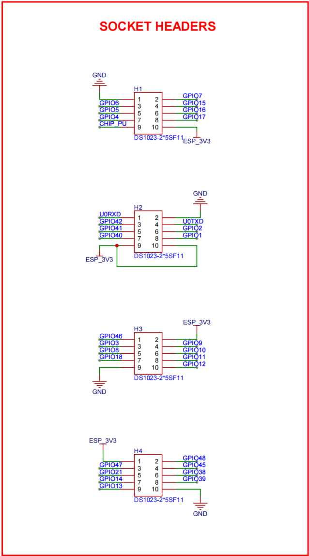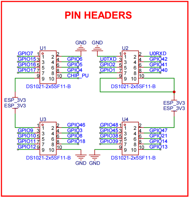 In this design, the main controller board is mounted on the upper side, so we use pin headers as connectors for easy assembly and disassembly. Considering mechanical stress and component placement, we selected four 2x5 headers to provide 10 connection points. This meets the signal transmission requirements between the main board and the extension board while also serving as structural support points to ensure stable and reliable connections.
