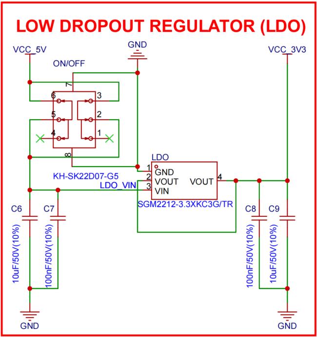 As shown in the figure, we use a linear regulator (LDO) to provide a stable output voltage for the system. The LDO converts the input voltage into the required regulated output to ensure normal system operation. When selecting the LDO, we considered output current capability, efficiency, and thermal performance to satisfy system power consumption and heat dissipation requirements. In addition, a power switch is included so users can turn the power on or off as needed to save energy.