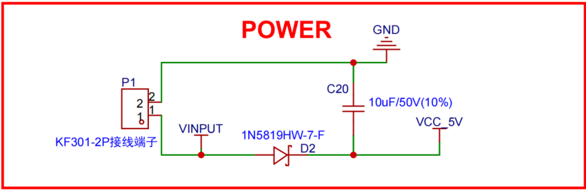 As shown in the figure, we designed a power input terminal and its supporting circuitry with reverse-polarity protection and decoupling capacitors. The input terminal provides a safe and reliable interface for connecting external power to the device. Reverse-polarity protection ensures that the device will not be damaged even if the power polarity is accidentally reversed. Decoupling capacitors help stabilize power delivery, reducing voltage fluctuations and noise to ensure normal device operation.