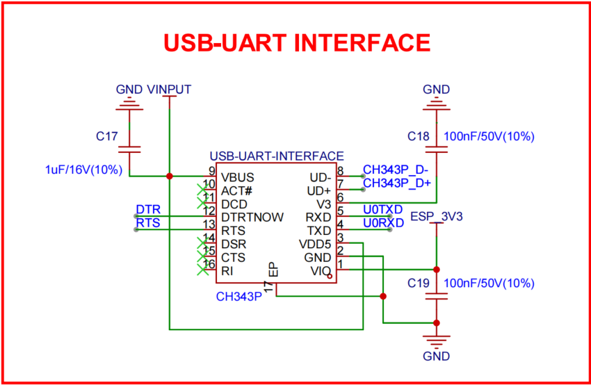 As shown in the figure, we integrated a USB-UART bridge chip (CH343P) to implement USB-to-UART functionality. This chip converts USB signals to UART signals, allowing users to perform serial communication and debugging through a USB interface. With this bridge chip, users can easily connect the device to a computer for data transfer, debugging, and firmware updates without additional serial adapters. This design improves compatibility and user experience, making development and debugging more efficient and convenient. Please note that users may need to install the corresponding driver to ensure proper communication performance.