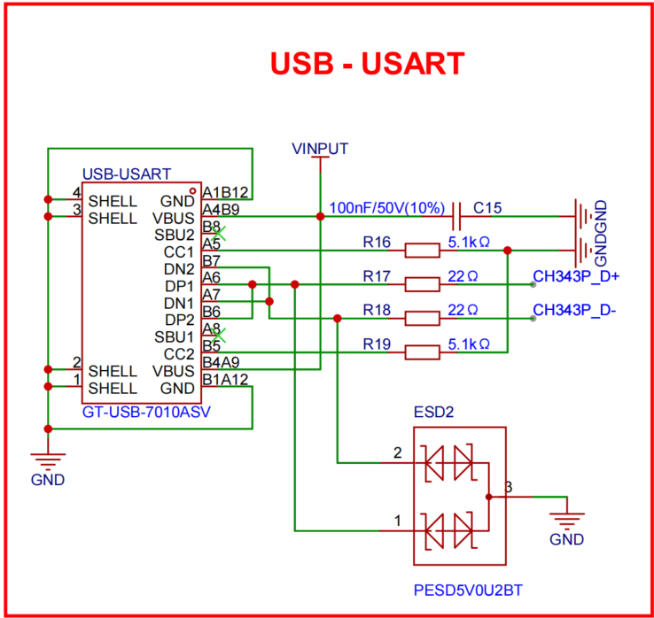 As shown in the figure, another TYPE-C interface is also integrated, mainly for USB-to-UART (USB-USART) functionality. This interface allows users to connect the device to a computer for serial communication and debugging. Through the USB-USART interface, users can conveniently perform data transfer, debugging, and firmware updates without additional serial adapters. This design improves compatibility and user experience, making development and debugging more efficient and convenient. Note that this interface requires a dedicated USB-to-UART bridge chip to ensure compatibility and stable communication performance.