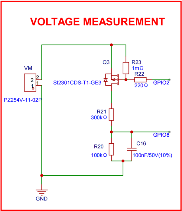 As shown in the figure, a voltage measurement circuit is integrated to monitor system voltage status. The circuit uses a voltage divider and ADC (analog-to-digital converter) to measure voltage, enabling real-time monitoring and helping keep operation within a safe range. To reduce power consumption, a PMOS transistor is used as a switch for the voltage measurement path, so users can enable or disable measurement as needed. In addition, a 1x2-pin header is provided as an output interface for voltage measurement data, making system monitoring and debugging easier. In general, the two pins of this header should be connected to the positive and negative battery terminals to measure the voltage before the BMS input stage, helping users understand battery condition and remaining capacity.