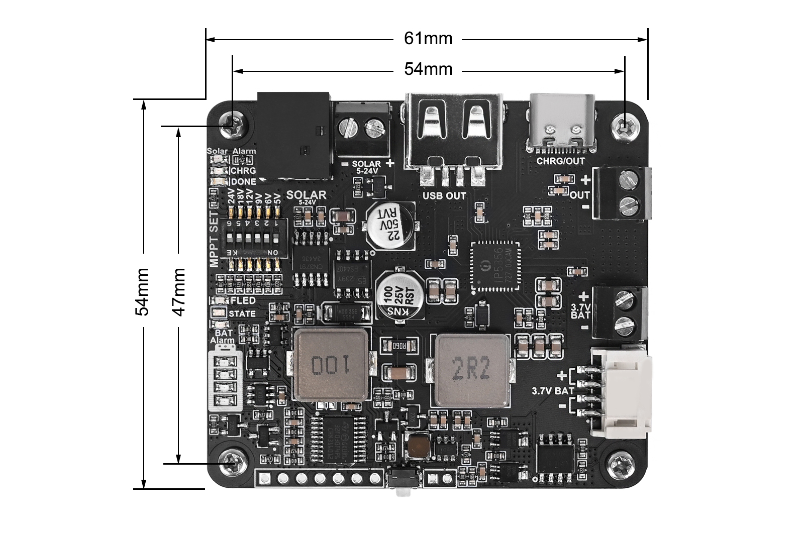 太阳能能源管理模块A支持通过太阳能电板和USB接口为3.7V 18650锂电池充电,配备5V/3.1A电压调节输出。集成MPPT(最大功率点跟踪)和电池充放电保护功能。